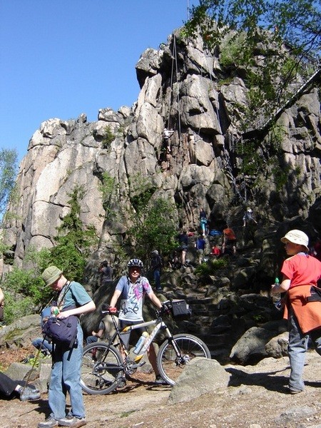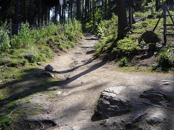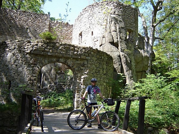 Trasę zaczynamy w Janowicach Wielkich np. na stacji PKP skąd ruszamy zielonym szlakiem turystycznym na południe. Tym szlakiem dojeżdżamy do lasu i od tego miejsca zaczyna się wspinaczka na Zamek Bolczów. Po drodze do zamku napotykamy kamienie, po których nie da się przejechać, ale jest ścieżka w prawo gdzie możemy je objechać. Po ominięciu tej przeszkody i dalszej wspinaczce docieramy do zamku. Tutaj możemy trochę odpocząć i popodziwiać panoramę Gór Rudawskich i Kaczawskich. W dalszą drogę ruszamy czarnym szlakiem turystycznym do Skalnych Bram i tutaj zmieniamy na szlak na niebieski turystyczny, którym dojedziemy do żółtego rowerowego. Żółtym dojedziemy do Przełęczy Karnickiej na parking samochodowy. Po drodze jadąc żółtym szlakiem możemy jeszcze zwiedzić skały: Skalny Most i Piec. Wyjeżdżamy z parkingu na szosę i skręcamy w lewo przejeżdżamy około 600 m i skręcamy w prawo około 320 stopni w ścieżkę szutrową, którą dojedziemy do Schroniska Szwajcarka. Od schroniska jedziemy czarnym szlakiem turystycznym na Krzyżną Górę. Niestety całego podjazdu nie udało nam się pokonać ze względu na kamienie, ale co nie uda się wjechać można wnieść rowery. Na sam szczyt to najlepiej wchodzić bez roweru. Ale wejście polecam ze względu na piękne widoki panoram Karkonoszy i Rudaw. Po zdobycie Krzyżnej Góry zjeżdżamy w dół z powrotem czarnym szlakiem aż do dojechania do szlaku czerwonego turystycznego, w który skręcamy w lewo i nim dojeżdżamy na Sokoliki. Z Sokolika Dużego możemy znowu obserwować piękne panoramy Karkonoszy, Rudaw i Kaczawy. Po nasyceniu się tymi widokami zjeżdżamy z powrotem czerwonym szlakiem do Schroniska Szwajcarka, a od schroniska jedziemy niebieskim szlakiem turystycznym, którym dojedziemy do szosy. Tutaj skręcamy w lewo i szosą dojeżdżamy z powrotem do Janowic Wielkich.