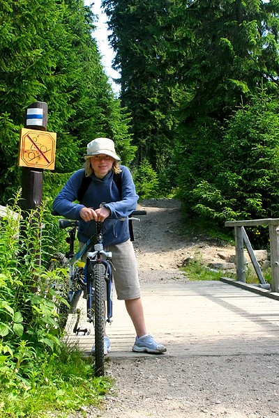 W tym miejscu napotkamy na bardzo niemiłą niespodziankę w postaci znaku zakazu wjazdu dla rowerów, tak więc w dalszą część trasy wyruszamy ze świadomością, że możemy narazić się na mandat (lub prowadząc rower). Jednak wiodąca dalej w górę asfaltowa droga kusi, więc jedziemy dalej, na chwilę skręcamy na czerwony szlak i na wysokości 1421 m n.p.m. docieramy do wspaniałego punktu widokowego Harrachovy Kameny. Stąd możemy podziwiać przepiękne widoki Karkonoszy. Gdy już nacieszymy swoje oczy pięknymi widokami, wracamy na asfalt i żółtym szlakiem jedziemy dalej aż do połączenia z niebieskim szlakiem - Pančavská louka. W tym miejscu kierujemy się do Harrachova właśnie niebieskim szlakiem. Będzie on trochę kamienisty, ale można nim zjechać. Oczywiście trochę nielegalnie - gdy dojedziemy do asfaltu zobaczymy, że ścieżka, którą zjeżdżaliśmy jest zamknięta dla rowerów.
