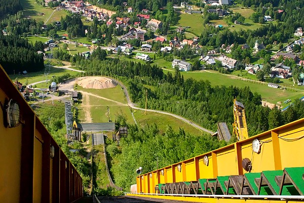 Asfaltem wjeżdżamy do Harrachova (ok 700 m n.p.m.), gdzie możemy się wybrać na słynną mamucią skocznię. Jako, że jest ona usytuowana na zboczu Certovej góry będziemy musieli albo skorzystać z wyciągu krzesełkowego, albo podjechać ścieżką rowerową na sam szczyt - 1020 m n.p.m. i stamtąd przejść się na samą skocznię, z której będzie niesamowity widok na całe miasto.