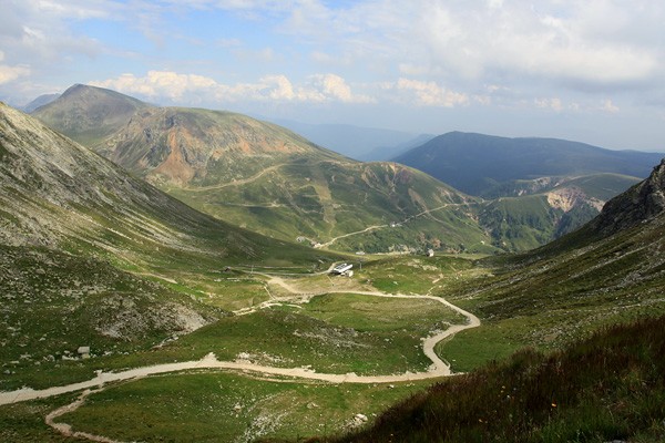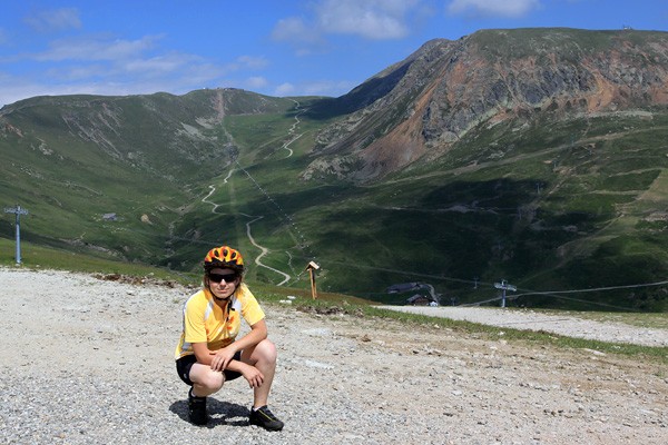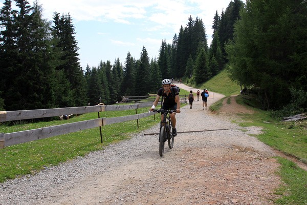 W tym miejscu zaczyna się prawdziwa jazda na rowerze górskim :) Do wyboru mamy kilka alternatywnych ścieżek. Wybieramy tą w kierunku chatek: Zueghutte, Meran 2000, Rotwandhutte, Piffing. Na rozgrzewkę ostro w górę i wśród drzew pniemy się do góry, ale co chwila się wypłasza, więc można złapać oddech. Na kolejnych rozjazdach obraliśmy kierunek na Kuhleitenhutte, gdyż to miejsce wydawało się najwyższe w okolicy. Po drodze mijamy wyciągi narciarskie i gdy przebrniemy przez bramkę drewnianą zaczynają się "schody". Ostry szutrowy podjazd w górę, momentami trzeba mieć naprawdę mocne "kopyto", albo trochę podprowadzić rowerek do góry. Końcówka się wypłaszcza, a widoki, które czekają nas na górze w pełni wynagradzają trud wspinaczki. Jak ktoś ma czas to piechotą można podejść na pobliską górę.