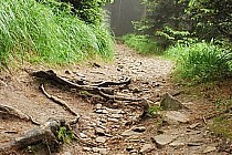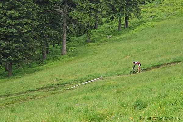 Najdłuższy i najbardziej wyczerpujący podjazd rozpoczyna się na ok. 17,5 km 780m n.p.m. oraz ma długość 6km i wiedzie on na 1280m w okolice Małego Śnieżnika. Następnie jest krótki zjazd pod schronisko pod Śnieżnikiem skąd w tym roku trasa zamiast prowadzić prosto skręca w lewo zgodnie z czerwonym szlakiem. Początkowy fragment tego zjazdu to głazy i kamienie, które powoli stają się coraz rzadsze, a przez to osiągane prędkości znacznie większe. Z tego fragmentu zjazdu można zapamiętać zdziwione miny turystów widzących rowerzystów jak mkną w dół na rowerach po tych kamieniach. Niestety na tym zjeździe pękła mi dętka w przednim kole, a próba napompowania nowej zakończyła się tym, że w rękach została mi pompka w dwóch częściach. W tym miejscu chciałbym pochwalić atmosferę panującą na tej imprezie, ponieważ bez większych problemów udało mi się pożyczyć pompkę, dzięki czemu mogłem kontynuować jazdę.