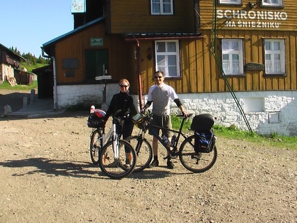 Razem z żoną postanowiliśmy spróbować turystyki górskiej na rowerach. To była nasza trzecia wycieczka. Wyprawę rozpoczęliśmy w Międzygórzu. Szybki zjazd do Wilkanowa. Następnie 5 km podjazd przez Idzików na przełęcz Puchaczówka, skąd dalsza wspinaczka na Czarną Górę. Tu kończy się asfalt, przed nami drogi szutrowe, koleiny i błoto. Po trudnym podjeździe chwila wytchnienia podczas zjazdu na Żmijową Polanę. Kolejna wspinaczaka, na Żmijowiec, nagrodzona cudowną panoramą Gór Bialskich i wspaniałym widokiem na Śnieżnik od strony północnej. Karkołomny zjazd na Przełęcz Śnieżnicką sprawia że bolą już nie tylko nogi, ale i ręce. Do schroniska Pod Śnieżnikem doszliśmy zwabieni pyszną jajecznicą na kiełbasie i piwem. Zapewniam że jest to najlepsza jajecznica na świecie (hihi). Dalsza część drogi wydawała się łatwa. Wszak miał być tylko niewielki podjazd pod Małym Śnieżnikiem i od Goworka to już spokojny zjazd z górki. Nic bardziej mylnego! Z powodu niedawnych opadów deszczów droga była grząska i pełna kałuż. Korzenie i konary skutecznie utrudniały podjazd. Na szczycie drogi pod Małym Śnieżnikiem znowu nagroda: niepowtarzalny widok na Halę Pod Śnieżnikiem i schronisko. Zjazd z pod Goworka do Międzygórza minął szybko po dobrze utrzymanej drodze szutrowej (żółtym szlakiem). Trasa zajęła nam ok. 8 godz. Zapewne z powodu częstych postojów na zdjęcia (hihi). Suma przewyższeń - ponad 1100 m.