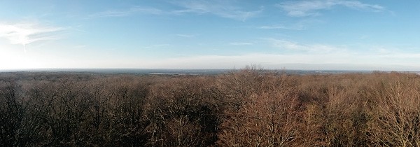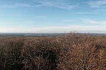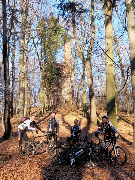 Żeby nie było nudno na mapie wynajdujemy inną trasę powrotną, wracamy do Gruszeczki i odbijamy w lewo na leśną, wąską i nieco podziurawioną asfaltową drogę. Kierujemy się na Pracze, dalej Postolin. Niebawem będzie lekki podjazd i gdy już trochę podjedziemy po prawej stronie będzie tablica z okolicznymi ścieżkami, w tym czerwony szlak pieszy prowadzący na Wzgórze Joanny. Podobno to najbardziej na północ wysunięte wzniesienie Wzgórz Trzebnickich mające 230 m. Od szosy mamy ok 1 km do szczytu łagodnie pod górkę. Na wierzchołku wzniesienia stoi zameczek myśliwski z 1850 roku z wieżą widokową z wąskim i wysokim kominem, o dziwo drzwi są otwarte więc krętymi schodkami można wejść na samą górę i podziwiać okolicę.