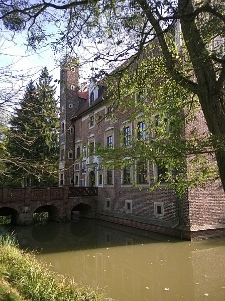 Po przejechaniu kilkuset metrów lekko wówczas błotnistą leśną drogą teren się podnosi i droga z błotnistej robi się sucha jak pieprz. Potem jeszcze chwila i wjeżdżamy na drogę oznaczoną znaczkami szlaku Świętego Jakuba (żółta muszelka na niebieskim tle). Trzymając się tych znaków leśnymi i polnymi drogami dojedziemy aż do bramy odgradzającej nas od terenu zamku na wodzie. Przed bramą trzeba skręcić w prawo i potem ulicą dojechać do głównej bramy, którą wjeżdża się na parking, z którego już tylko krok do pięknego zamku.
