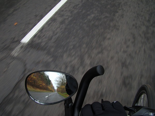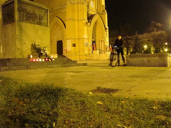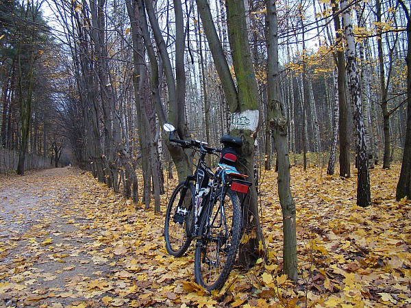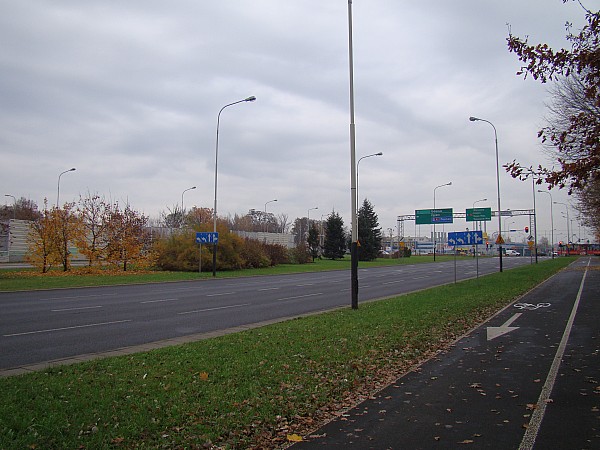 Ścieżka rowerowa przy al. Włókniarzy, przyprószona opadłymi liśćmi , opustoszała. Może już wszyscy w drodze a może na Marszach Niepodległości.