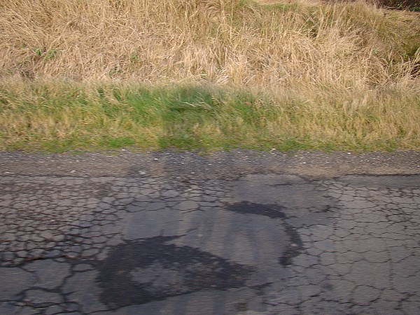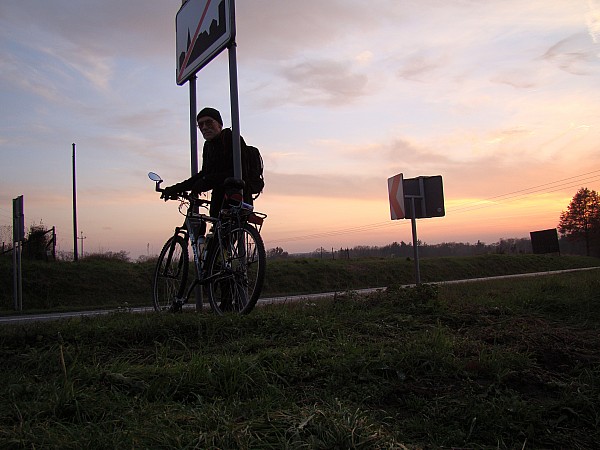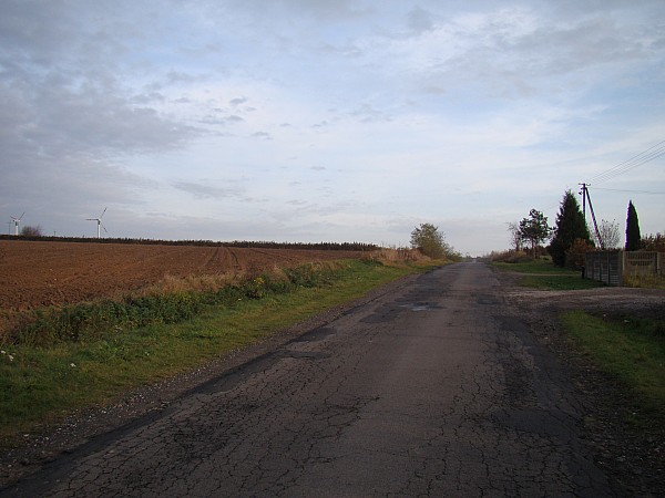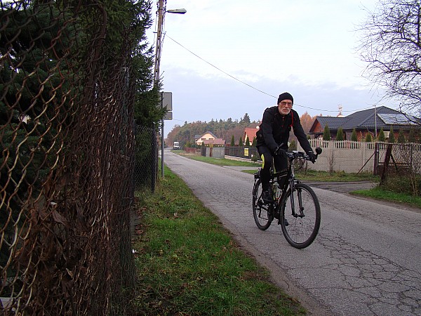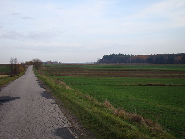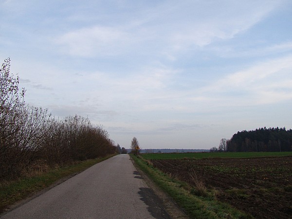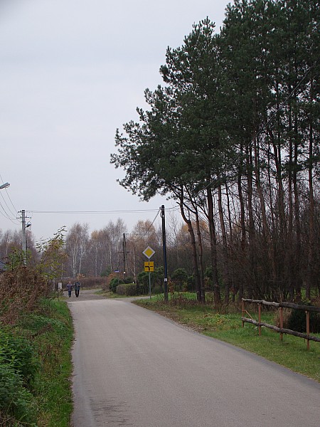 W Woli Cyrusowej dziękuję czarnemu szlakowi i ruszam w kierunku Kołacina. Już nie sam. Uwielbiający słoneczko towarzysz Cień nie
