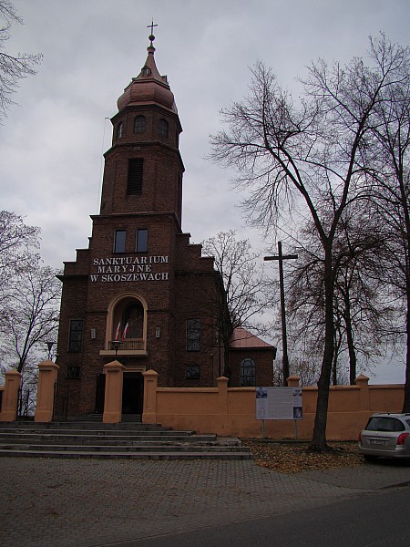 Z szaro brunatnego krajobrazu wyłania się neobarokowa kopuła Sanktuarium MB Skoszewskiej .