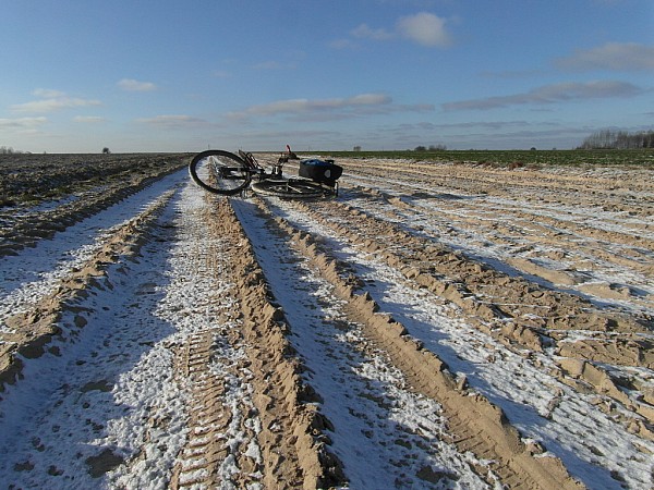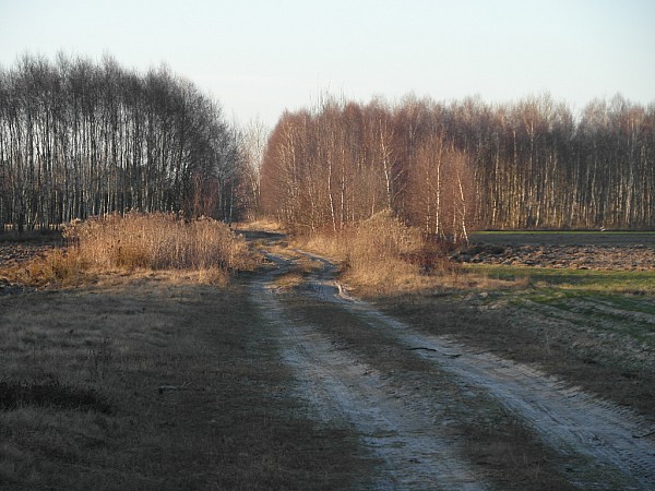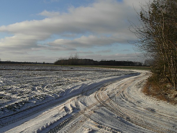 Zmieniam swoją marszrutę i podążam w przeciwnym kierunku. Droga prowadzi przez pola szeroką gruntówką po mocno zmrożonych koleinach.