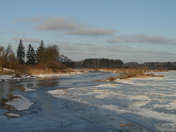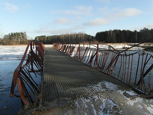 W miejscowości Wólka Proszewska szlak skręca w kierunku rzeczki. Podążam za nim. Doprowadza mnie do mostku przerzuconego przez wartki nurt. Niepewnie wkraczam na ten inżynieryjny cud z zamiarem przeprawienia się na drugą stronę.