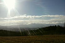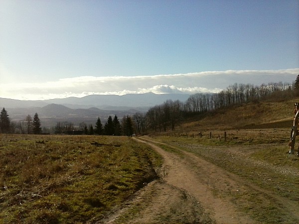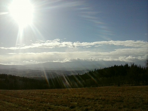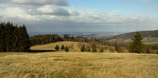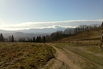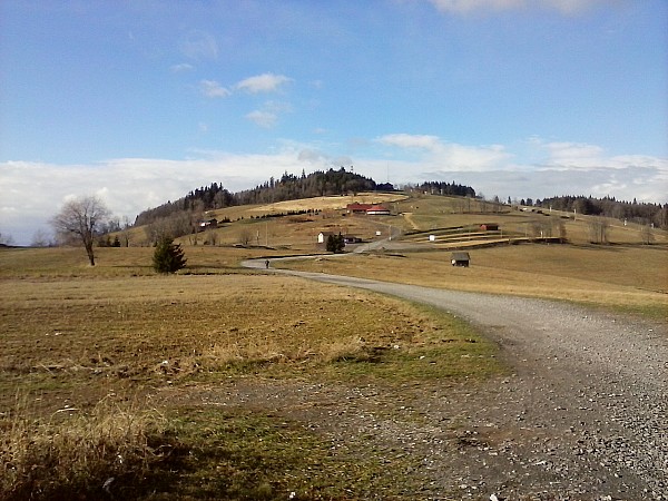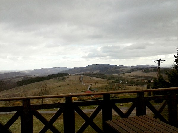 Ze Skopca zjeżdżamy z powrotem na Przełęcz Komarnicką i kierujemy się na Łysą Górę dalej jadąc niebieskim szlakiem pieszym. Po drodze na tym szlaku jak mamy na tyle szczęścia, że przejrzystość powietrza jest dobra to mamy cudowne widoki na Karkonosze. Po dojeździe tym szlakiem do szosy skręcamy w prawo i później skręcamy w lewo w pierwszą drogę. Tą drogą dojeżdżamy na szczyt Łysej Góry. Na Łysej Górze w schronisku można sobie zrobić przerwę na jakiś obiadek. Ja polecam pierogi ruskie, które są sprzedawane w schronisku.