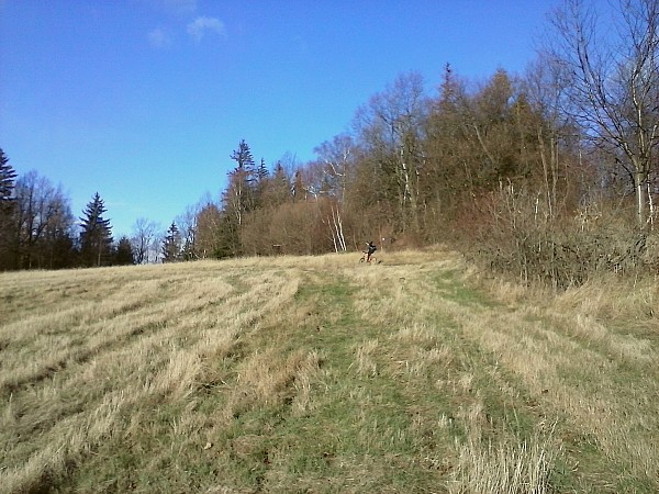 Z Łysej Góry zjeżdżamy na początek nieoznakowaną drogą, którą dojeżdżamy do żółtego szlaku rowerowego i nim jedziemy do Chrośnicy. Tutaj wjeżdżamy na niebieski szlak pieszy, którym to jedziemy na Okole. Końcówka niestety z wnoszeniem roweru na górę, ale warto było dla widoczków, jakie rozpościerają się ze szczytu. Po zjeździe dalej niebieskim szlakiem do szosy z Okola z orientowałem się, że można było inaczej wytyczyć tą trasę i była by ona bez noszenia roweru i na pewno następnym razem pojadę tą drogą. Dale już jedziemy leśnymi nieoznakowanymi drogami do Wojcieszowa.