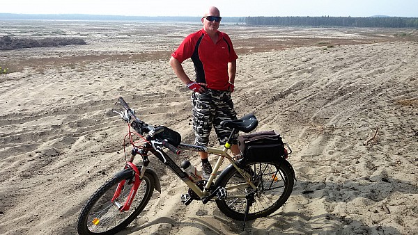 Ciśniemy dziś na Jurę Krak-Częst.Dobrze mi znanymi drogami bez postojów szybko docieramy do Jez.Pogoria IV.Odpoczynek,kilka foci i trasą rowerowa wzdłuż brzegu na północ jeziora a dalej z nawigacją przez Chruszczobród,Wiesiółke do Niegowonic.Trafiamy tu na parafialny odpust i droga przy kościele zamieniła się w deptak.W sklepie kupujemy po dwa radlerki na drogę i pędzimy w kierunku wsi Chechło by zerknąć na Pustynie Błędowska.Docieramy na skraj lasu pchając rowery na niewielkie wzniesienie wszędzie piach.Wypijamy po piwku i kręcimy do wsi Rodaki. Szlak rowerowy stromy i kamienisty.Oglądamy drewniany kościółek i dalej szlakiem rowerowym do Ryczowa.Ten odcinek bardzo ciężki,sam piach często prowadzimy rowery.