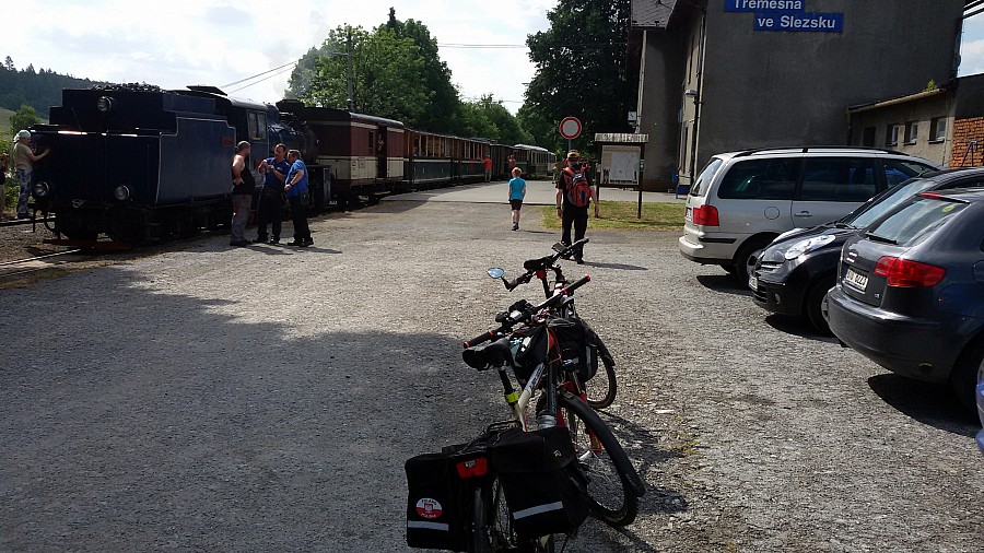 Punktualnie o dziewiatej z kumplem wysiadamy z pociagu na dworcu w Prudniku.Zwiedzanie miasta zostawiamy na inną wycieczkę a dzis chcemy się skupić na odcinku czeskim a więc od razu śmigamy do granicy.Kilka fotek i jedziemy do Mesta Albrechtice po drodze zatrzymując się w miejscowości Trzemeszna.Ogladamy kolejkę waskotorową która regularnie jezdzi na trasie do Osoblachy a prowadzona jest wąskotorowym parowozem.Na ryneczku w Albrechticach posilamy się nieco i jedziemy dalej trasą rowerową 55 która prowadzi aż do Opawy.Trasy rowerowe są fajnie poprowadzone a przede wszystkim świetnie oznakowane,nie sposób się zgubić.Cały czas wzdłuż rzeki Opawy docieramy do ładnego miasteczka Krnov,po drodze robiąc sobie przerwe na kufelek zimnego radegasta.Ogladamy rynek,ratusz i kościół sw.Marcina gdzie dało nam się wejść na jedną z wiez chwile przed tym jak miła pani udała się na godzinną przerwę.Kolejny cel na trasie to Opawa.W połowie drogi opuszczamy szlak i wbijamy na DK 57 by nadgonic trochę czasu.Objezdzamy ważniejsze zabytki,posilamy się na rynku i cisniemy dalej ,przez kolejne wioski docieramy do miejscowości Hat,gdzie wychylamy po kufelku tym razem ciemnego piwka.Po drodze do granicy oglądamy jeszcze piękny pałac w Szilcherzowicach i meldujemy się na stacji w Chałupkach wsiadając prosto do czekającego juz pociagu.